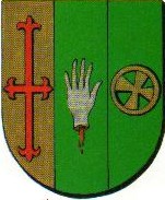 Escudo de Armas del Apellido Obregón: En campo de sinople, una mano de plata, cortada y destilando sangre; segundo, en campo también de sinople, una rueda de oro; y el contramantel, de oro, con una cruz hueca y floreteada de gules.